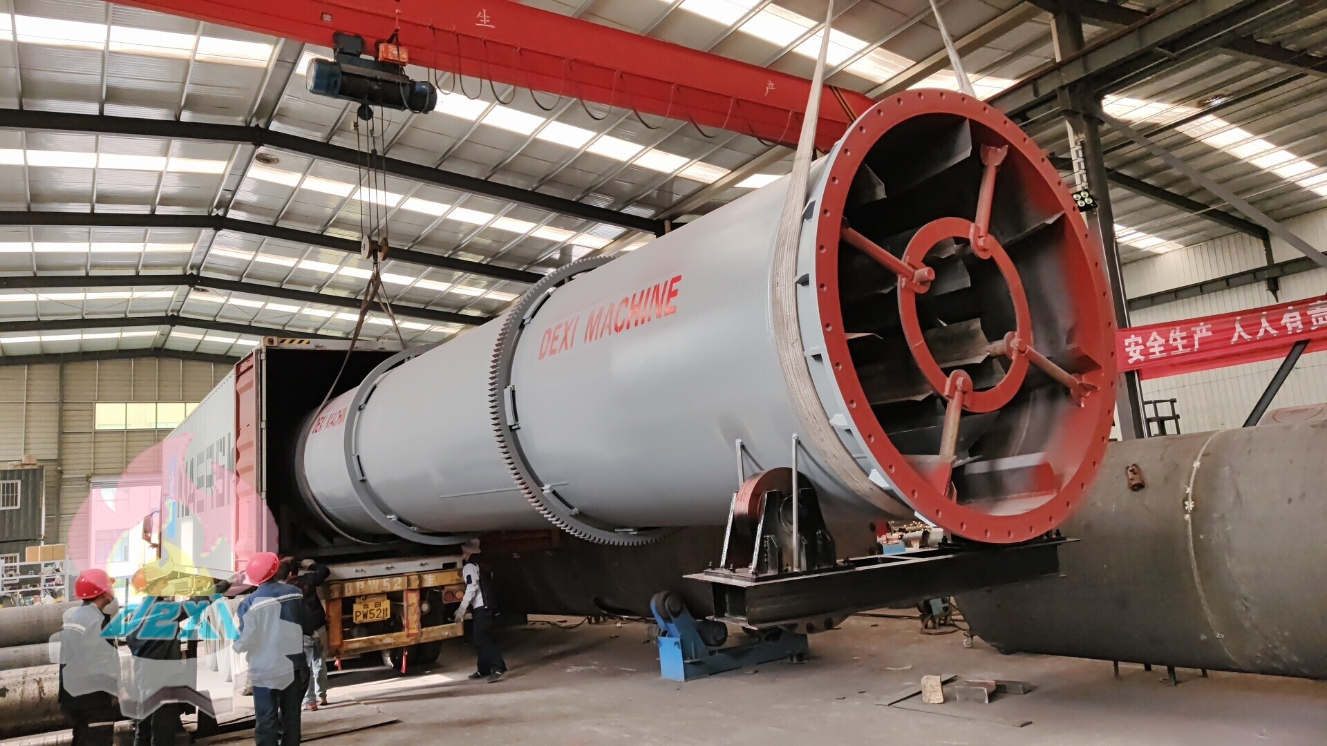 The drying body of the industrial rotary dryer is composed of a cylinder, a ring gear and rolling rings. Supported by the front and rear rolling rings, the drying body is placed on the riding wheel device and the thrust wheel device. The axial movement of the drying body can be controlled by adjusting the riding wheel device and the thrust wheel device.The driving device drives the drying body to rotate through the ring gear. With a variable frequency motor as the power source, it can realize stepless speed regulation and meet the requirements of different rotating speeds.