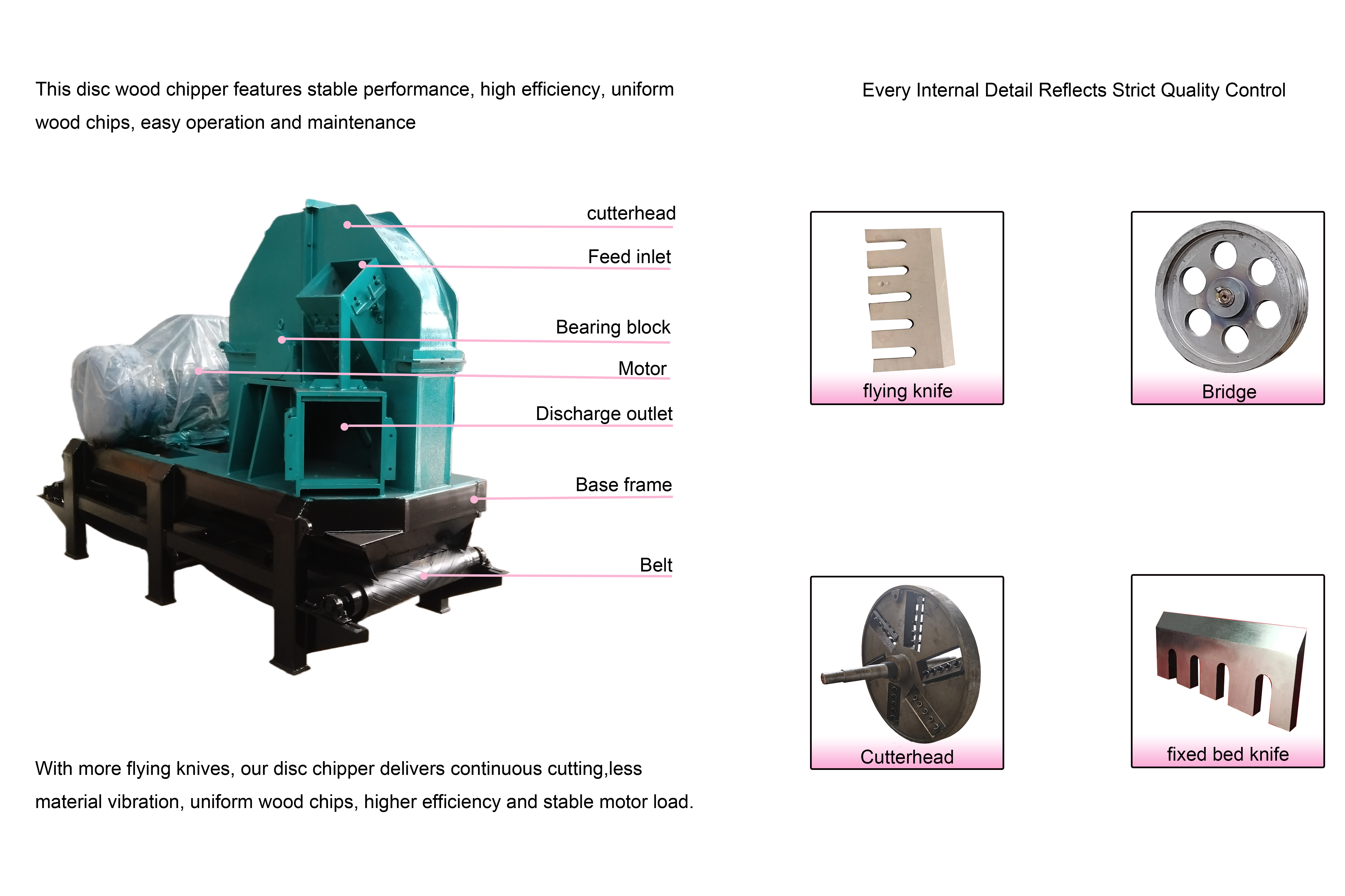 Mian Advantages- Our disc wood chipper produces uniform, high-quality wood chips with low impurities, ideal for industrial mass production and widely used in various industries.