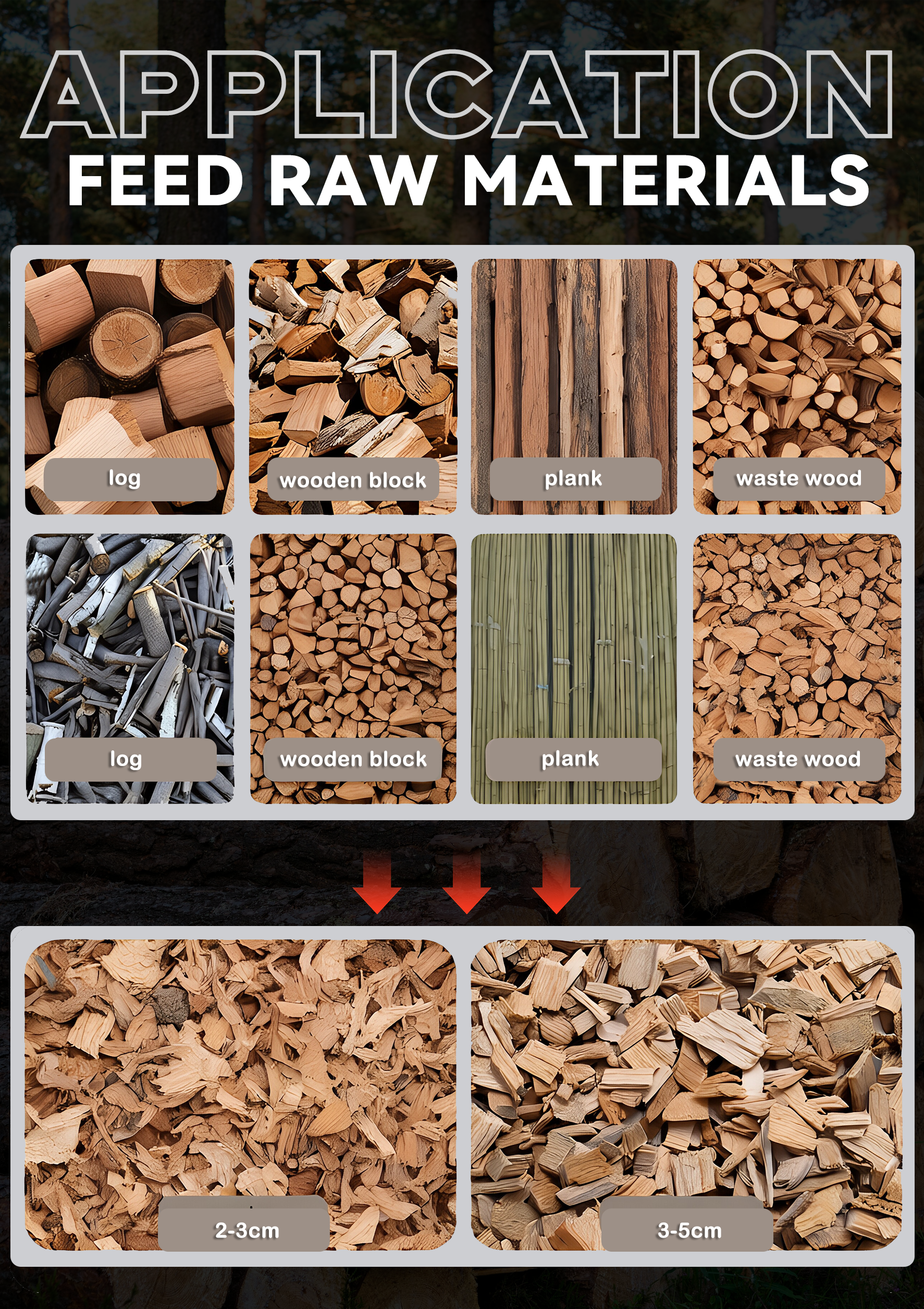 Can handle a variety of raw materials, uniformly cutting logs, branches, waste veneers, bamboo and other raw materials into 2-5 cm standard wood chips (customizable size)