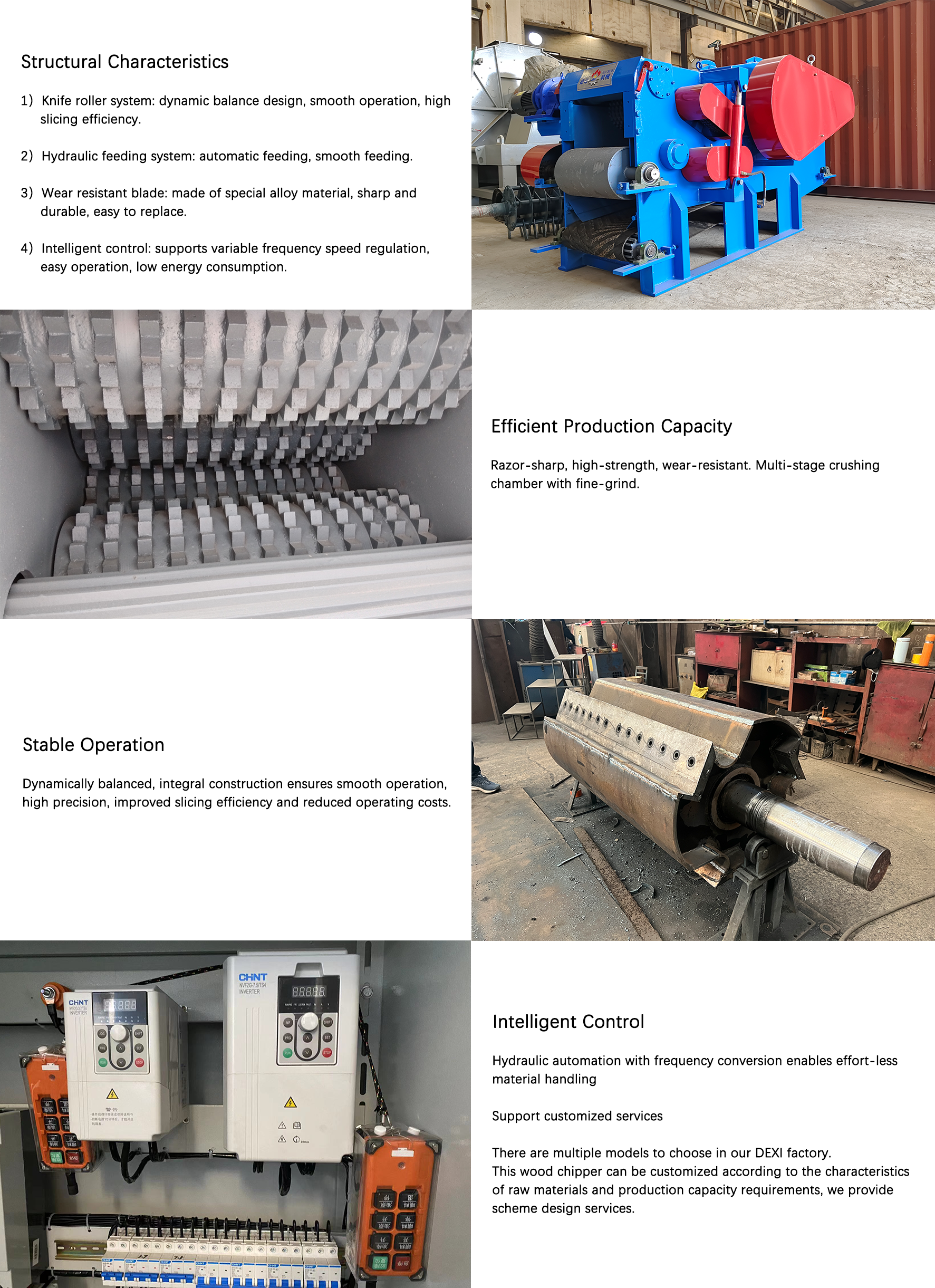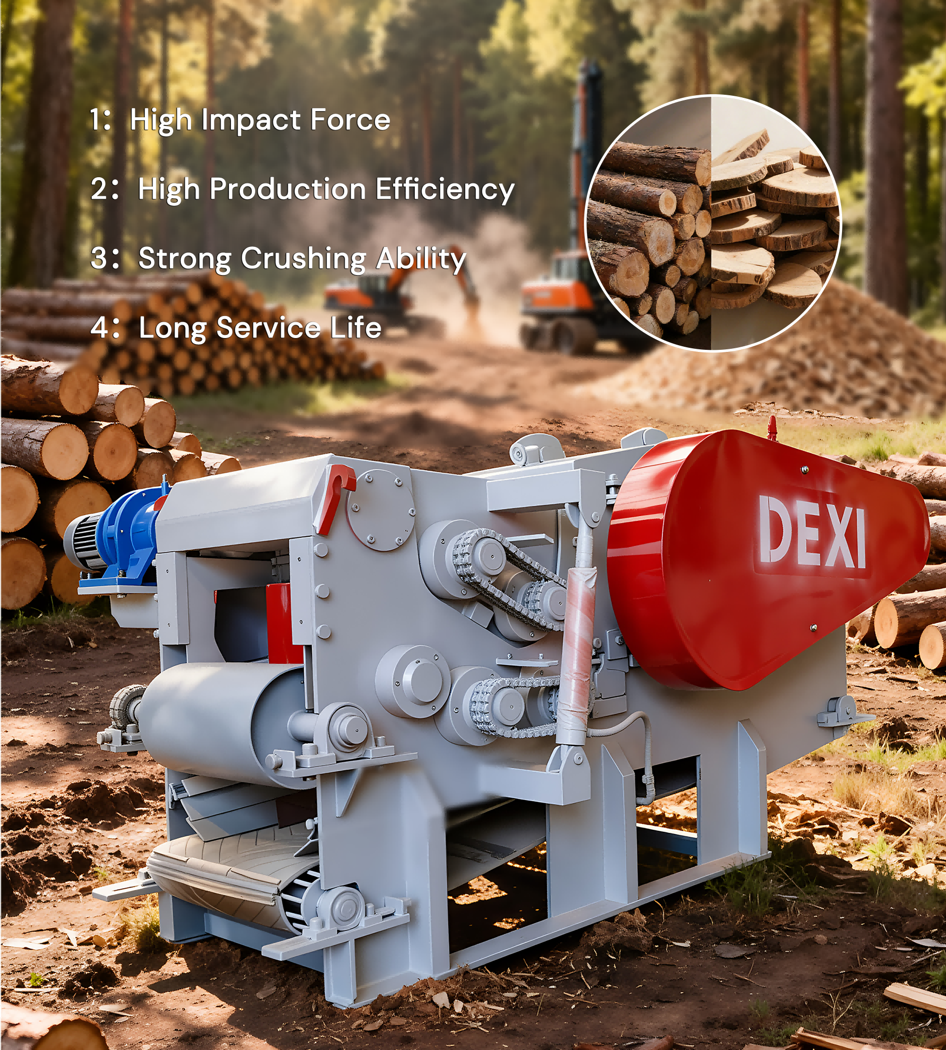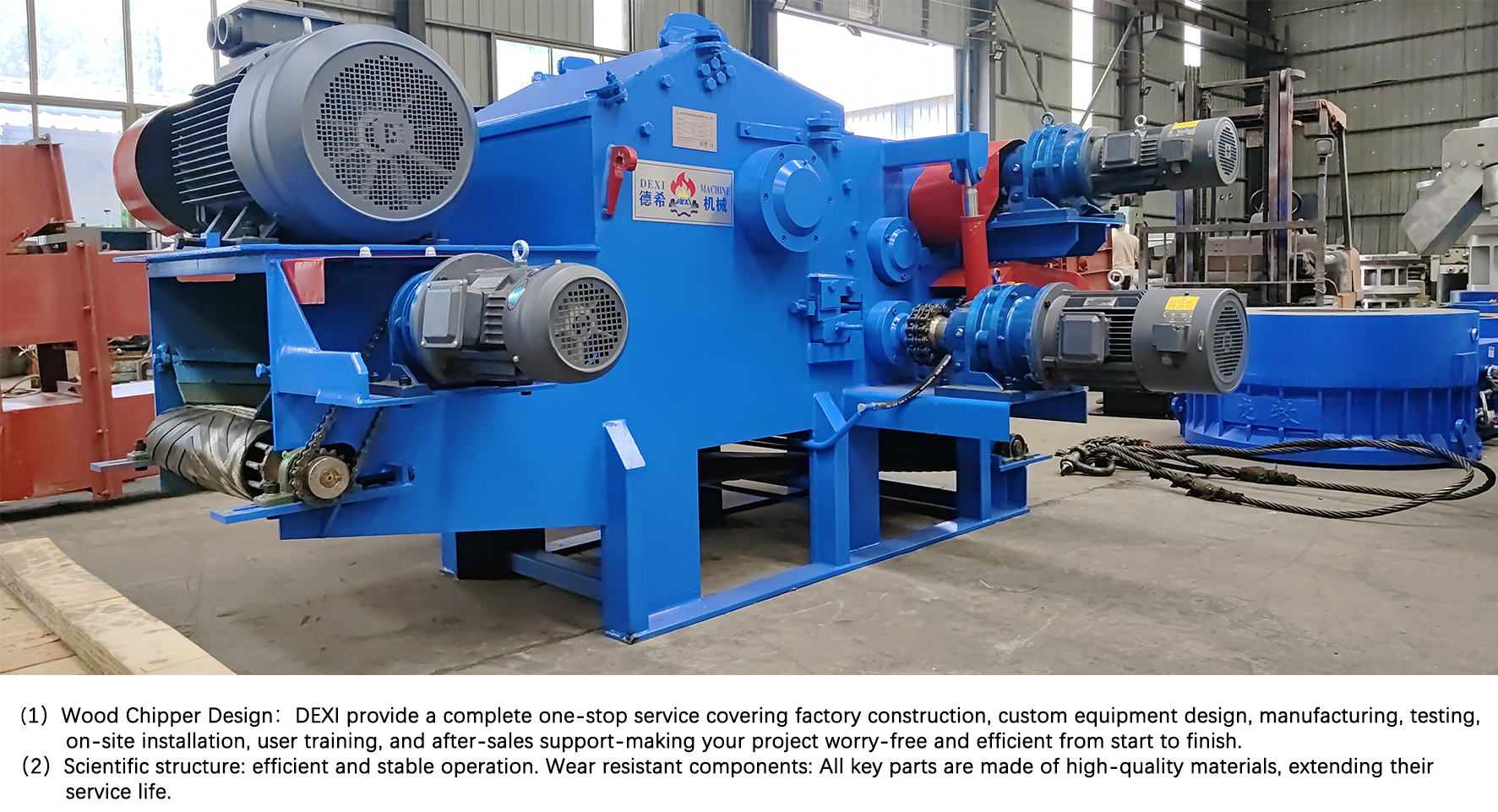 DEXI drum wood chipper is a powerful, heavy-duty machine designed to process logs, branches, slabs, and other wood waste into uniform wood chips. The thickness of last chips is 3mm-5mm, length and width is about 15-30mm, it is wood chips not wood shavings. It is characterized by its namesake component: a large, rotating steel drum mounted with multiple hardened steel cutting blades. By adjusting knives gap, outlet chips dimension will be adjusted.