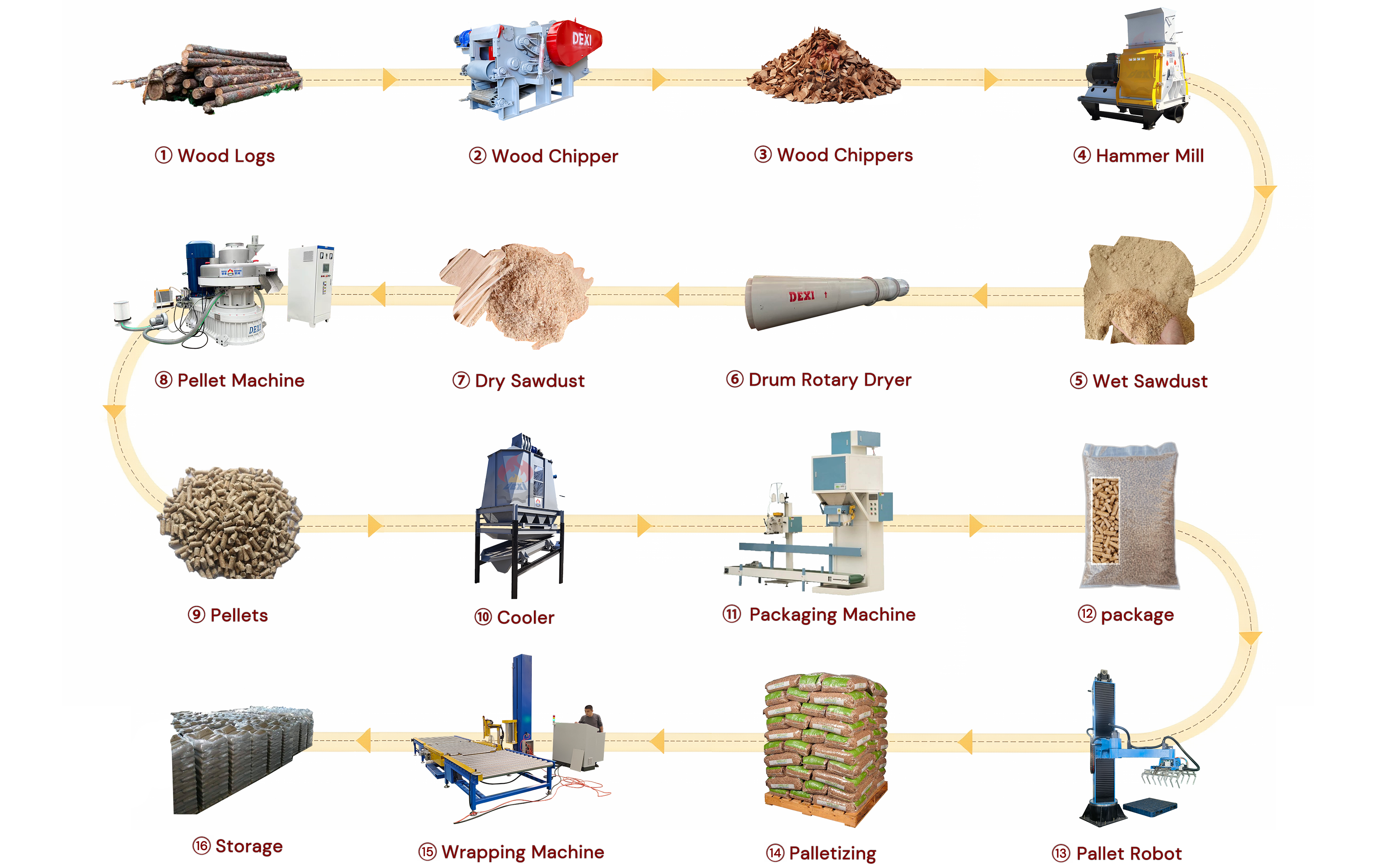 The main process of a complete wood pellet production line includes several key systems: wood chipping, crushing, drying, pelletizing, cooling, and automatic packing. This fully integrated setup efficiently converts raw materials into high-quality, ready-to-use pellets — providing you with a seamless, one-stop solution for pellet production.