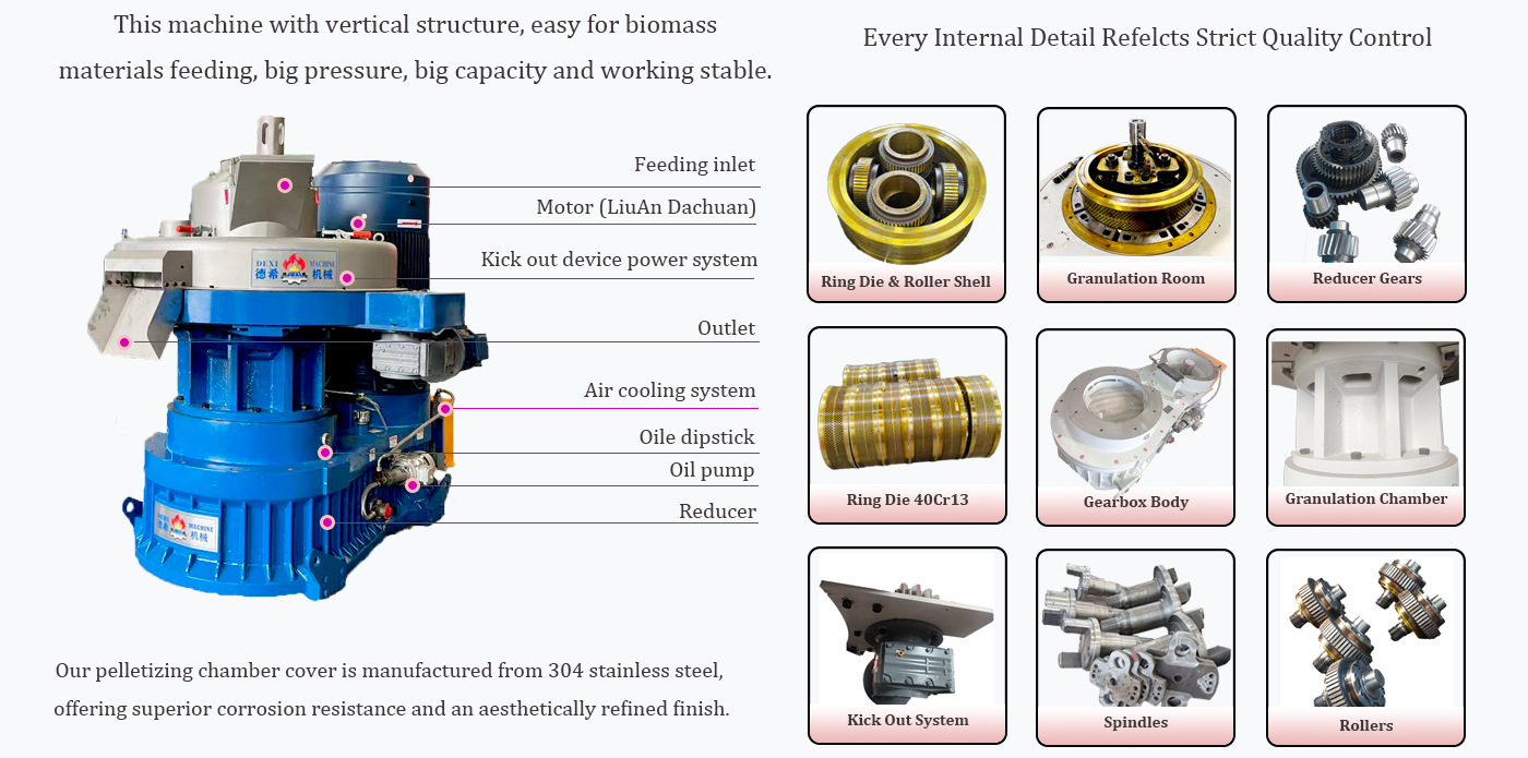 The DEXI vertical ring die wood pellet machine processes a wide range of forestry and wood waste—including logs, planks, offcuts,sawdust, leaves, wood shavings, timber scraps, grapevines, branches, forks, bark, twigs, tips, shrubs, corn stalks, wheat stalks, rice straw, cotton stalks, rice husks, peanut shells, sunflower seed shells, walnut shells, coconut shells, sugarcane bagasse, and dregs of traditional Chinese medicine.branches, stems, roots, wood blocks, discarded furniture, and sawmill residues—into clean, renewable fuel pellets with a standardized diameter of 6-12 mm.